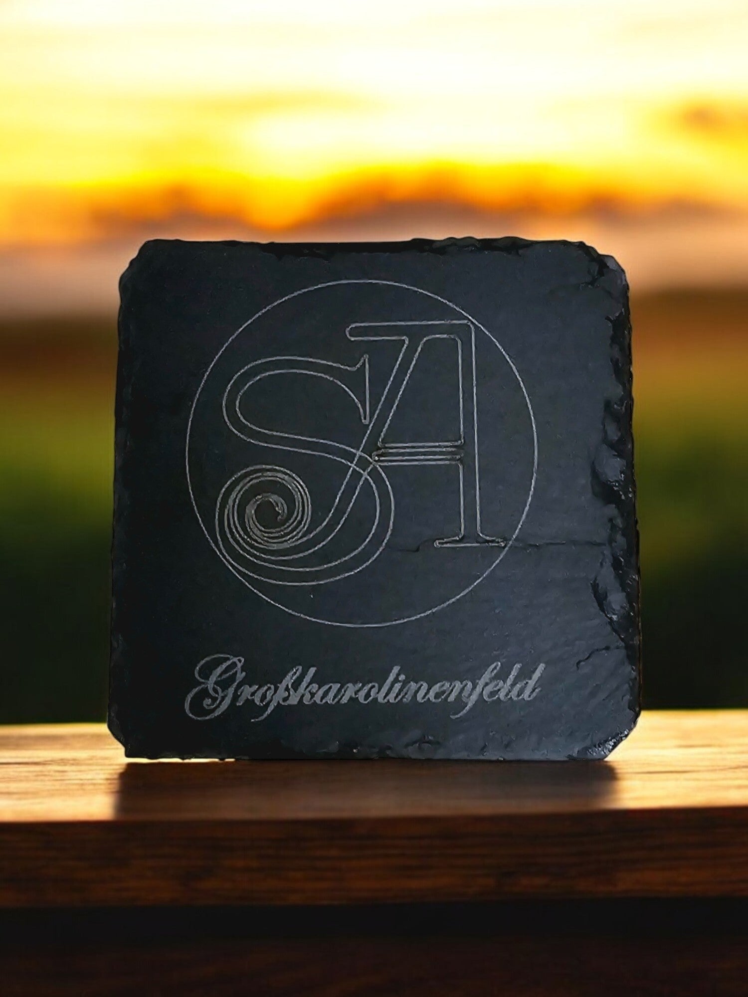 Untersetzer aus Schieferplatte schwarz mit Gummifüßen und individueller Gravur. Maße (LxBxH): 10cm x 10cm x 1cm